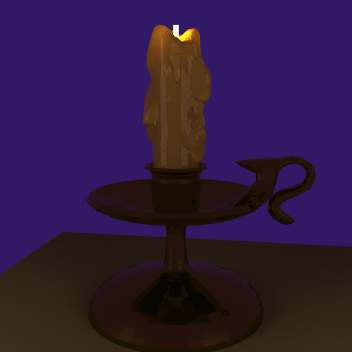 Note: When I presented this project, someone pointed out the strange looking blue-ish streaks down the side of the candle. Those are the area lights that I used to give some ambient lighting to the scene, I just didn't realize that they would show up in the reflection off material I used for the candle. You can still see the effects of the subsurface scattering, though, since the candle itself is a neutral color, and the area light representing the flame is the only source of warm light in the scene.